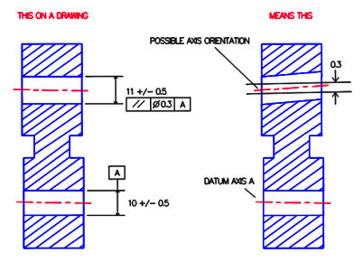 In the left figureabove, the boxedparallelismsymbol and toleranceare used to control the center axis of a hole. The boxed symbols can be read “This axis must lie between two planesparallel tothe axis A and spaced 0.3 apart”. Note that if the boxed tolerance includes a diameter symbol, indicating a cylindrical tolerance zone, the tolerance would apply to all views.